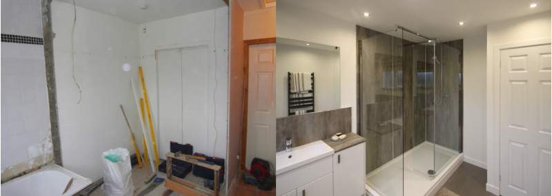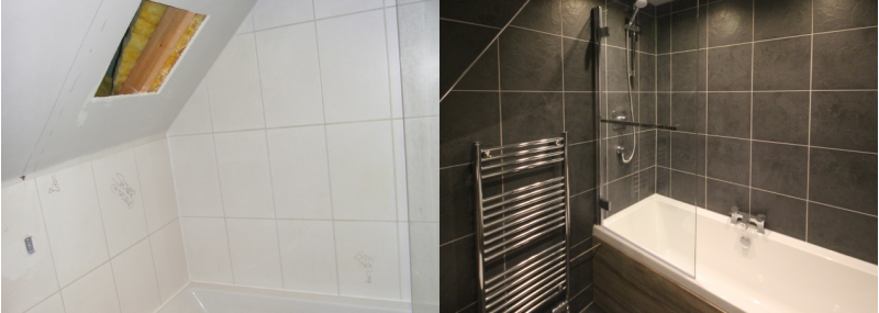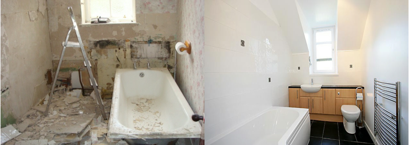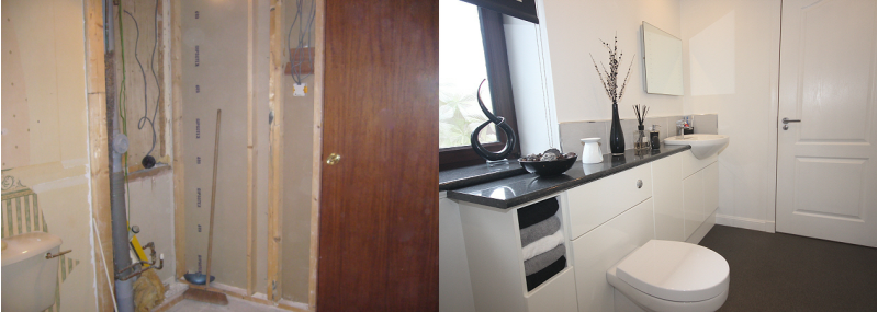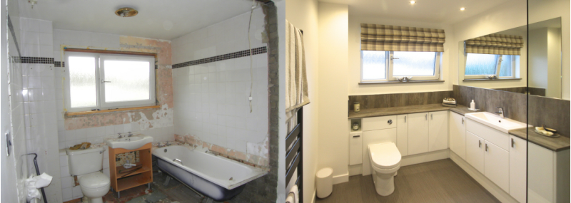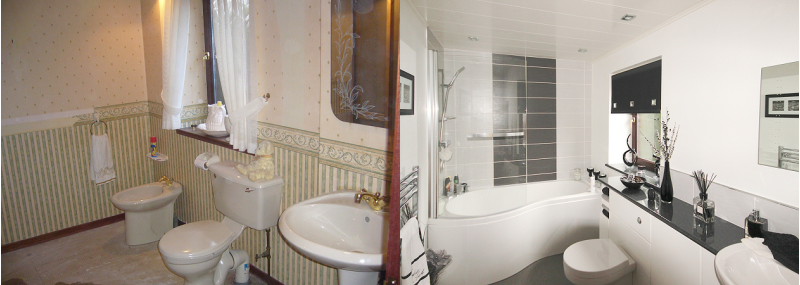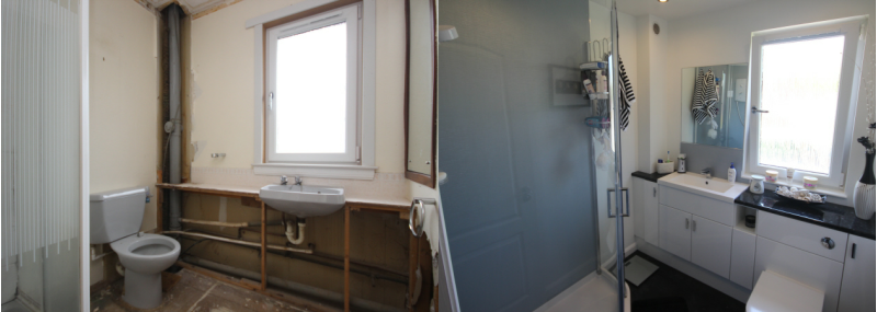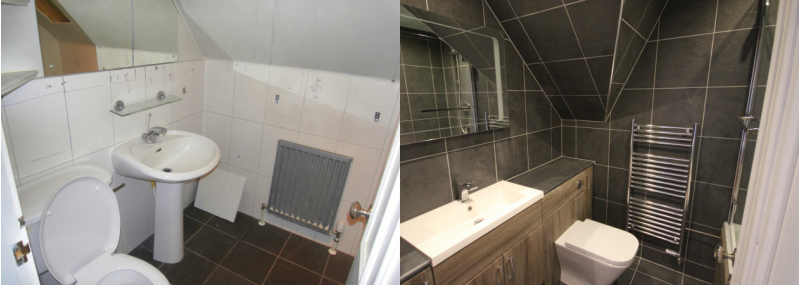 Each image shows, the bathroom, before & after they were completed.